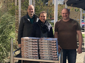 Solidarität – kaum ein Politiker und kaum ein Mediziner kommt in seinen öffentlichen Statements momentan ohne diesen Begriff aus. Die Deutsche Fortbildungsakademie Heilwesen GmbH der Famile Feldmann hat, gemeinsam mit dem Gasthaus d`Badisch aus Eggenstein-Leopoldshafen, am Montag gezeigt wie gelebte Solidarität in der Realität aussehen kann: Am Eingang der AWO Seniorenzentrums Hardtwald überreichte das Gasthaus um die Mittagszeit 40 Pizzen für das gesamte Personal.