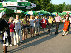 Tanzlehrerinnen zeigten zudem landestypische Tänze und luden anschließend zum aktiven Mitmachen ein. Mutige durften sich gemeinsam, unter Anleitung der Profis, mit einem Sirtaki-Tanz probieren. Heimleiter Bär: „Nach einigen Fehltritten sah dieser Sirtaki dann auch gut aussah und hat den Beteiligten sowie Zuschauern viel Freude bereitet.“ Außergewöhnliches Engagement bewiesen darüber hinaus die Bewohnerinnen und Bewohner des Seniorenzentrums Hardtwald und bereicherten das Festprogramm mit südeuropäischen Darbietungen der Kraft- und Balance-Gruppe sowie einer Vorführung der Gymnastikgruppe. Musikalischer Höhepunkt des griechischen Sommerabends war das von einer Bewohnerin und einer Pflegekraft gemeinsam vorgetragene Lied „Unchained melody“.